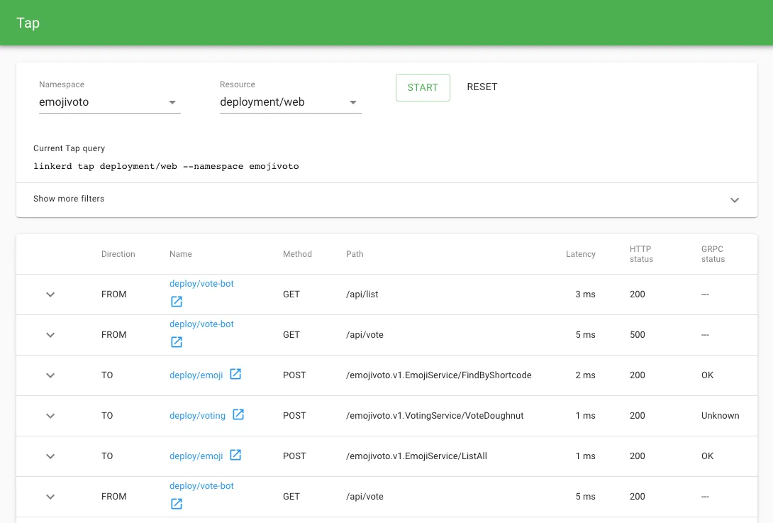 Shows the stream of requests across a single pod, deployment, or even everything in the emojivoto namespace.
